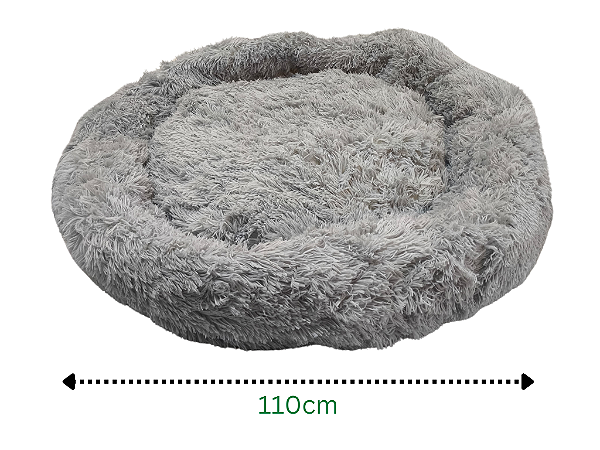 Cama Nuvem Gigante: 110cm de diâmetro, ideal para cachorros de grande porte com peso de 25kg a 65kg. Também recomendada quando mais de 1 animal dorme junto. São 110cm de diâmetro externo. A altura das bordas é cerca de 20cm.