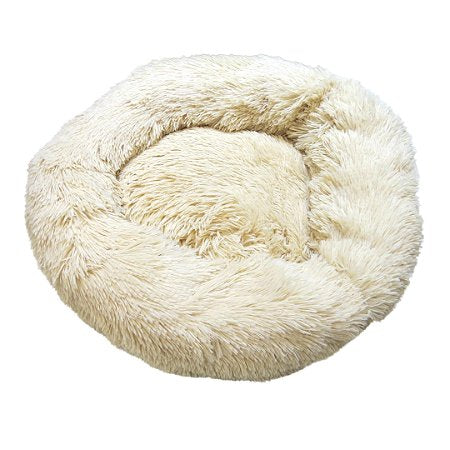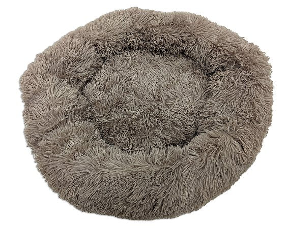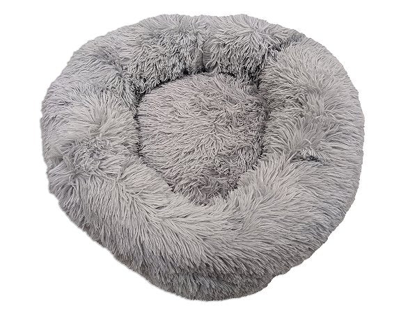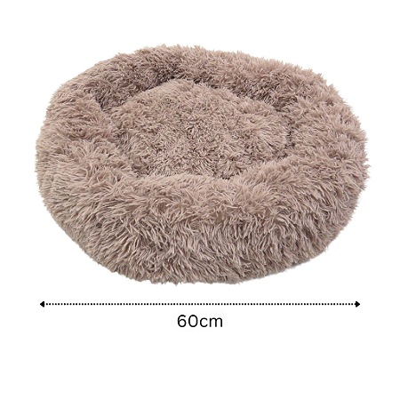 Cama Nuvem Grande: 60cm de diâmetro e 16cm de altura, para cachorros de pequeno e médio porte com 3.5kg até 12kg.